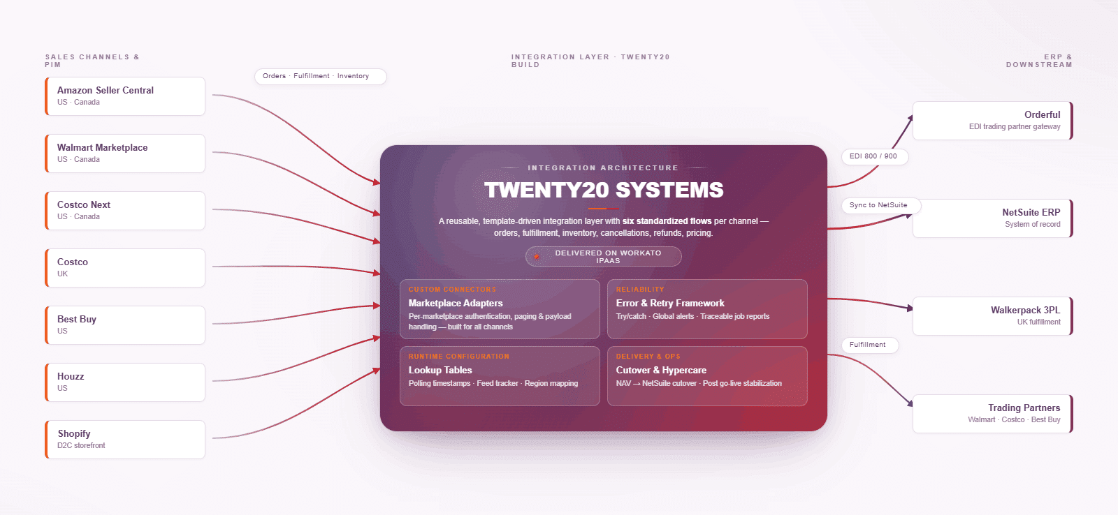 Throughout the build, Twenty20 coordinated closely with third-party providers, including EDI partners such as Orderful, to ensure clean data exchange for retail trading relationships including Walmart, Costco, and BestBuy. The architecture itself was implemented on Workato as the iPaaS layer.